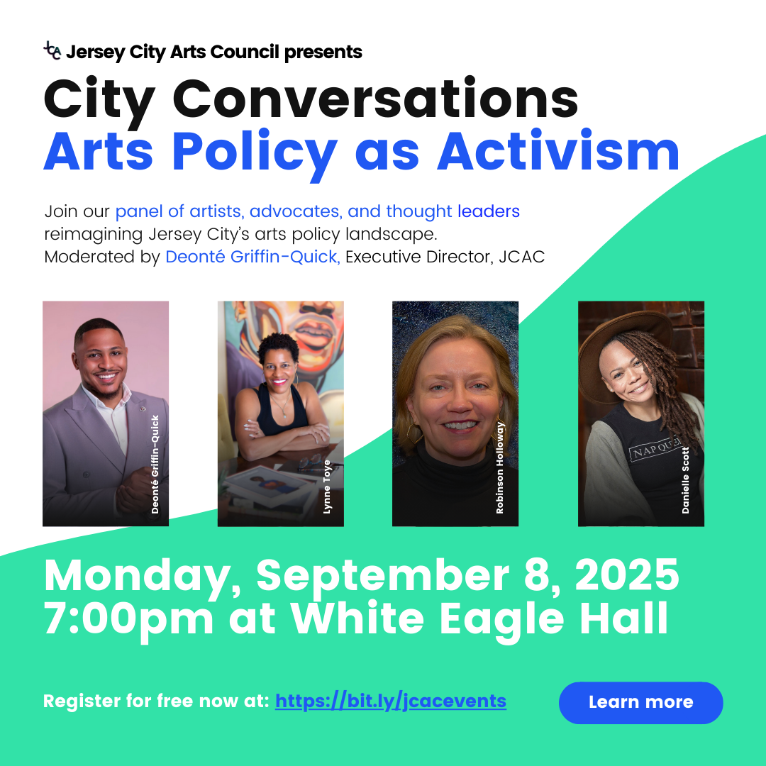 As an advocate for community and innovation, Jersey City Arts Council is committed to sparking dialogue that inspires action to support the local arts community. City Conversations is a new program designed to bring together voices from across sectors—artists, arts workers, businesses, civic leaders, and policymakers—to explore the forces shaping Jersey City’s creative landscape. Through thought-provoking panels and open exchange, the series aims to fuel collaboration, deepen understanding, and strengthen the vitality of our arts ecosystem.