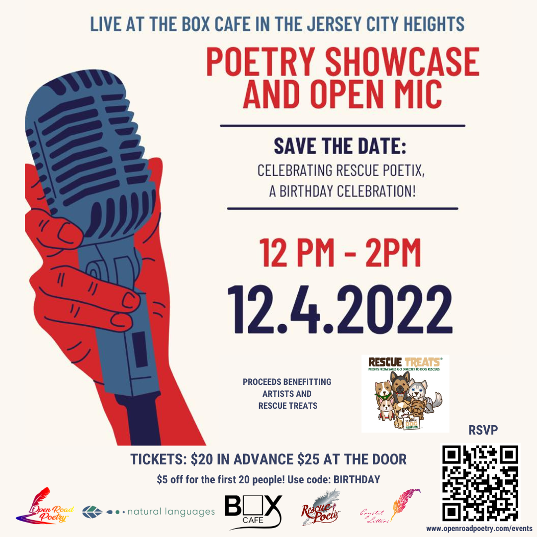 OpenRoad Poetry is pleased to present its lineup for RescuePoetix Birthday Poetry Showcase and Open Mic Fundraiser at The Box Cafe, Jersey City.